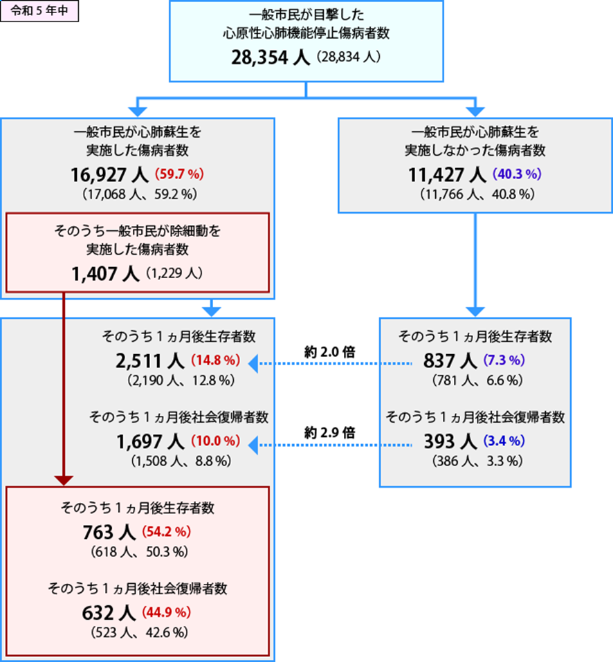 心肺蘇生を施行された方が圧倒的に1か月後の生存数、社会復帰数が増えます。